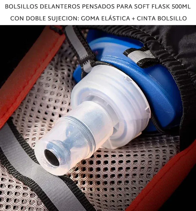 El chaleco cuenta con un compartimento trasero con cierre elástico doble seguridad —perfecto para guardar ropa técnica, protectores, avituallamiento o accesorios— y múltiples bolsillos delanteros de malla expandible: destinados a soft flasks de 500 ml, móvil (hasta 6.8”), llaves u otros objetos pequeños. Los bolsillos laterales de acceso rápido y los tiradores reflectantes mejoran la funcionalidad y la visibilidad en condiciones de poca luz.