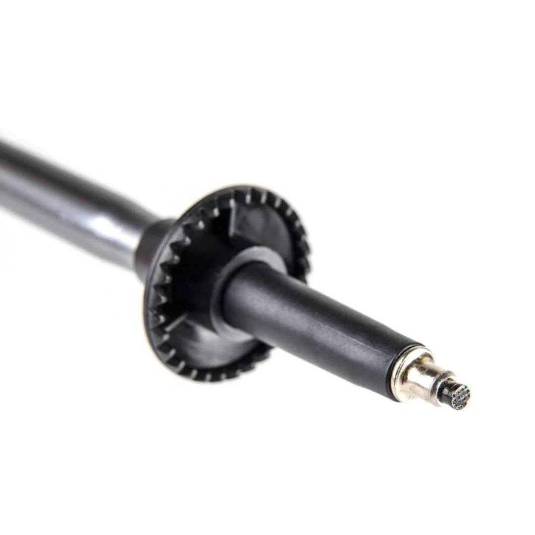 - Cuenta con una roseta y una punta de hierro protegida por tapones de goma removibles. Estos últimos aumentan la superficie de contacto del bastón con el suelo, protegen la punta del mismo, y disminuyen las vibraciones del bastón hacia los brazos.