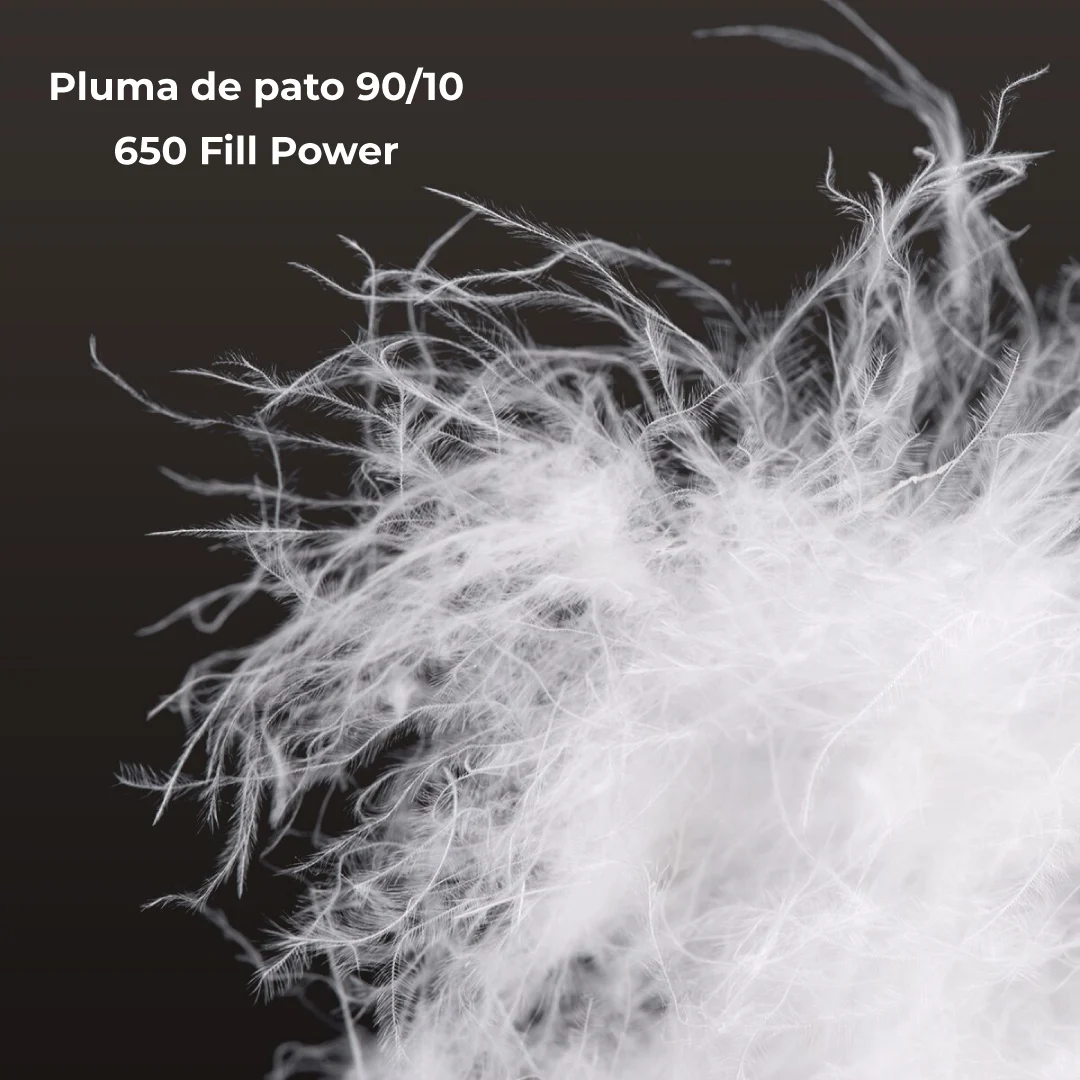 La zona de los pies cuenta con una base 3D que brinda mayor comodidad durante el descanso. Para su transporte, incluye una bolsa de compresión que reduce significativamente su volumen y una bolsa de malla para almacenamiento a largo plazo, ideal para evitar que la pluma pierda sus propiedades.