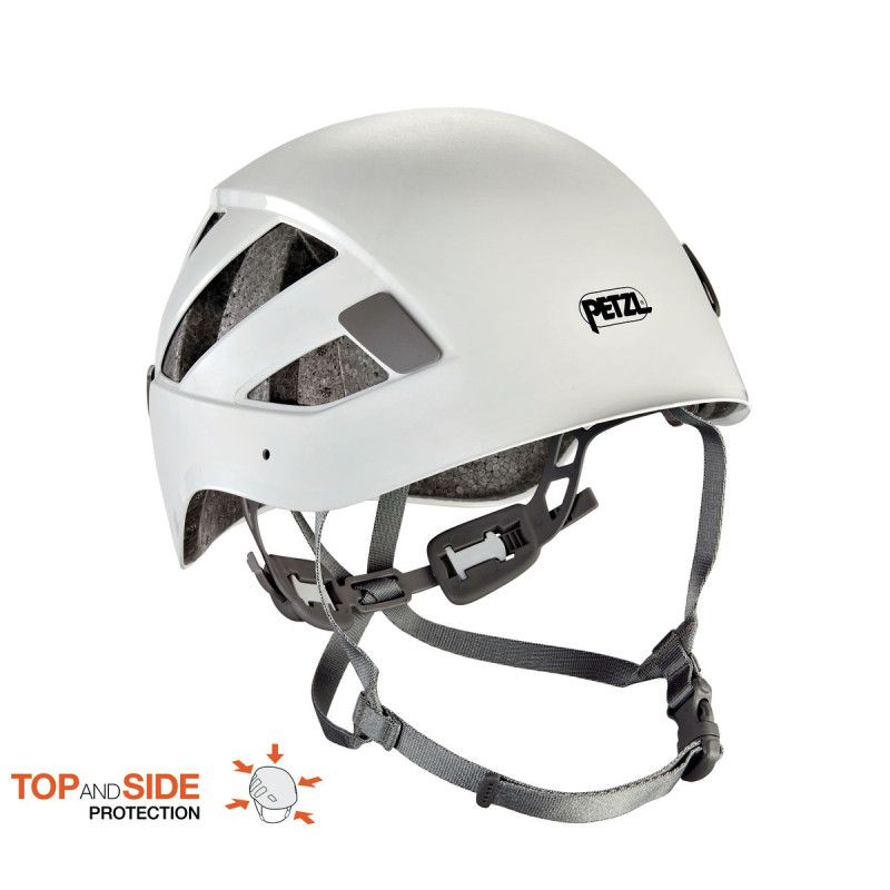 – Diseño envolvente, más bajo en la zona posterior, para una mayor protección contra la caída de piedras, los impactos laterales, delanteros y posteriores (sello TOP AND SIDE PROTECTION de Petzl).
