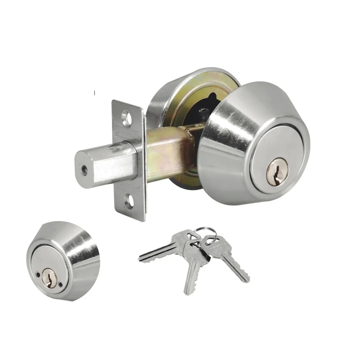 Cerradura cerrojo doble cilindro cromo mate se utiliza para dar una seguridad extra para cerrar puertas y muebles de madera.