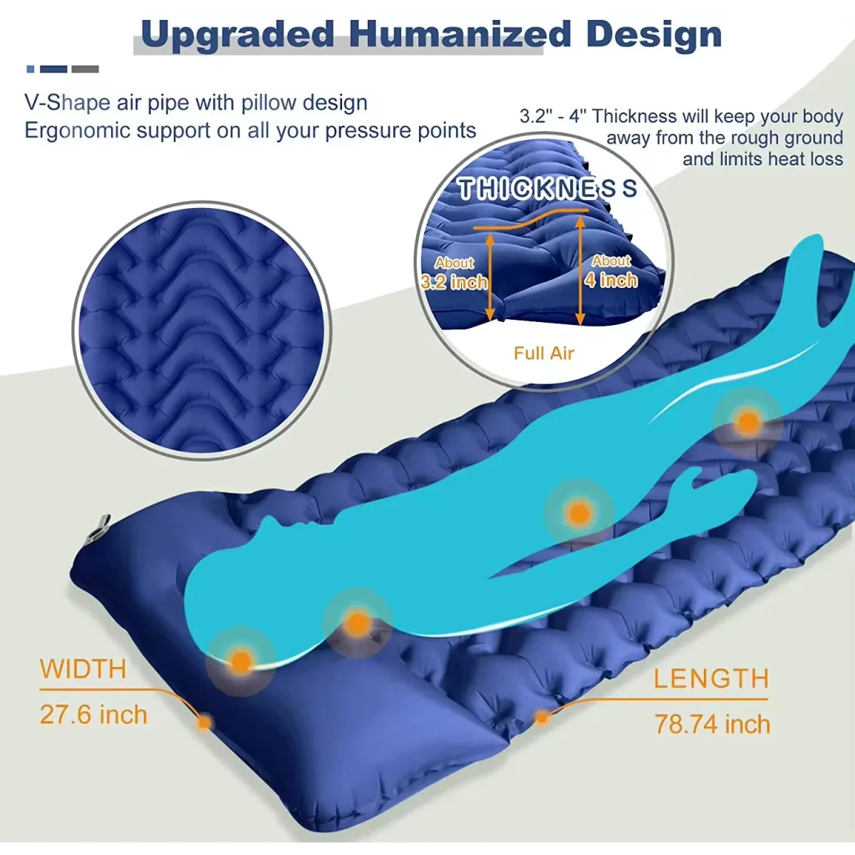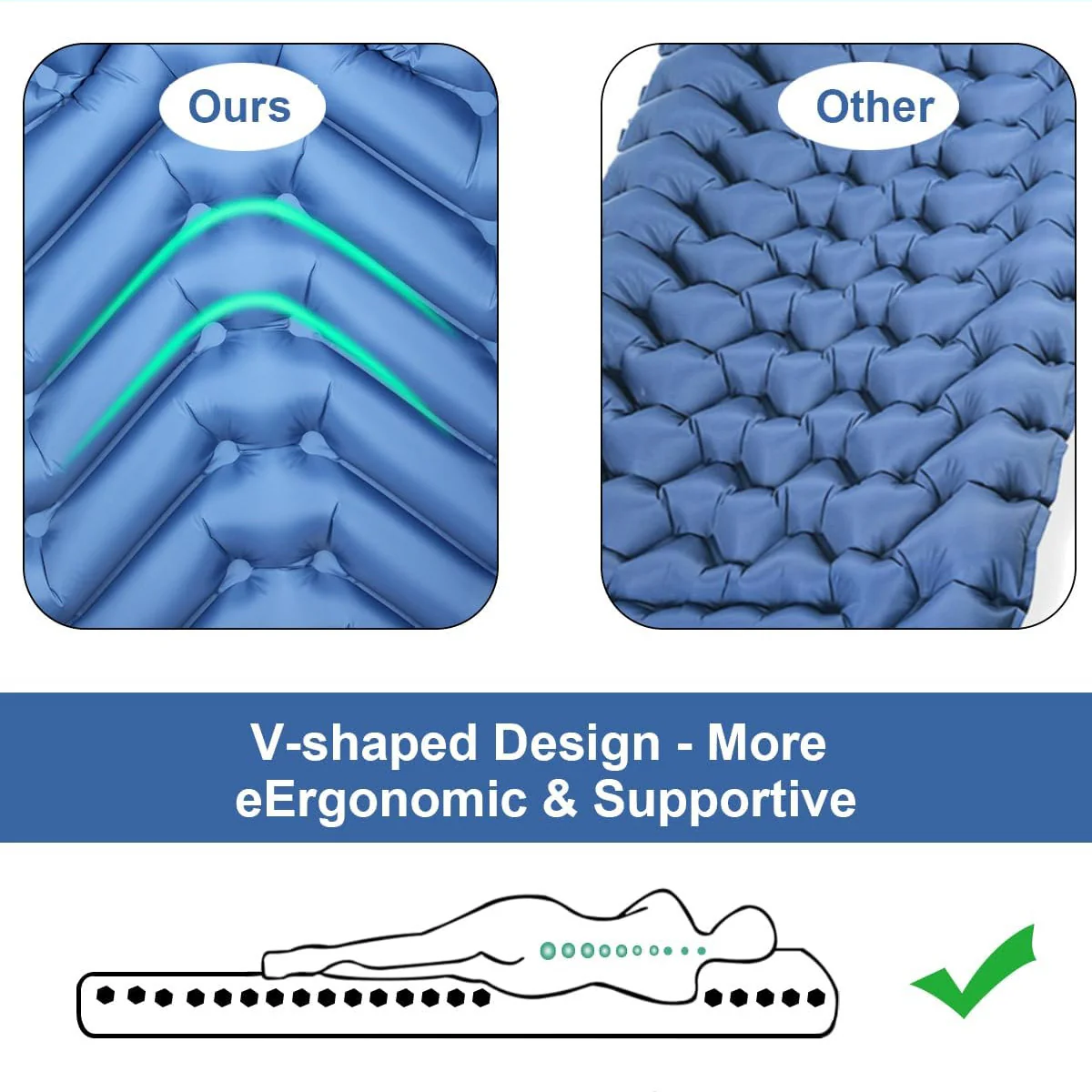 El diseño del colchón en V le permite mantenerse fresco, transpirable, mientras aísla la humedad, frío, suciedad, relieves toscos y hasta el viento en caso de dormir en hamaca.
