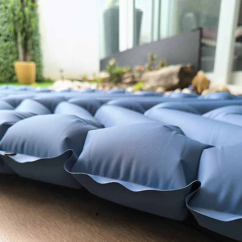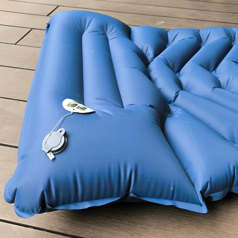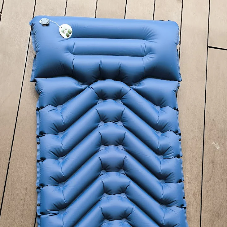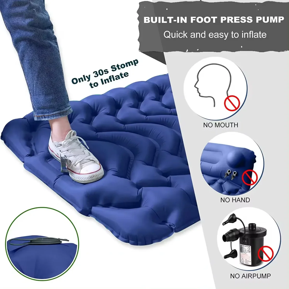 El mecanismo de inflado no requiere compresores de aire ni sofocar sus pulmones, basta con 30 segundos de pisadas sobre una válvula incluida dentro del mismo colchón para inflar por completo.