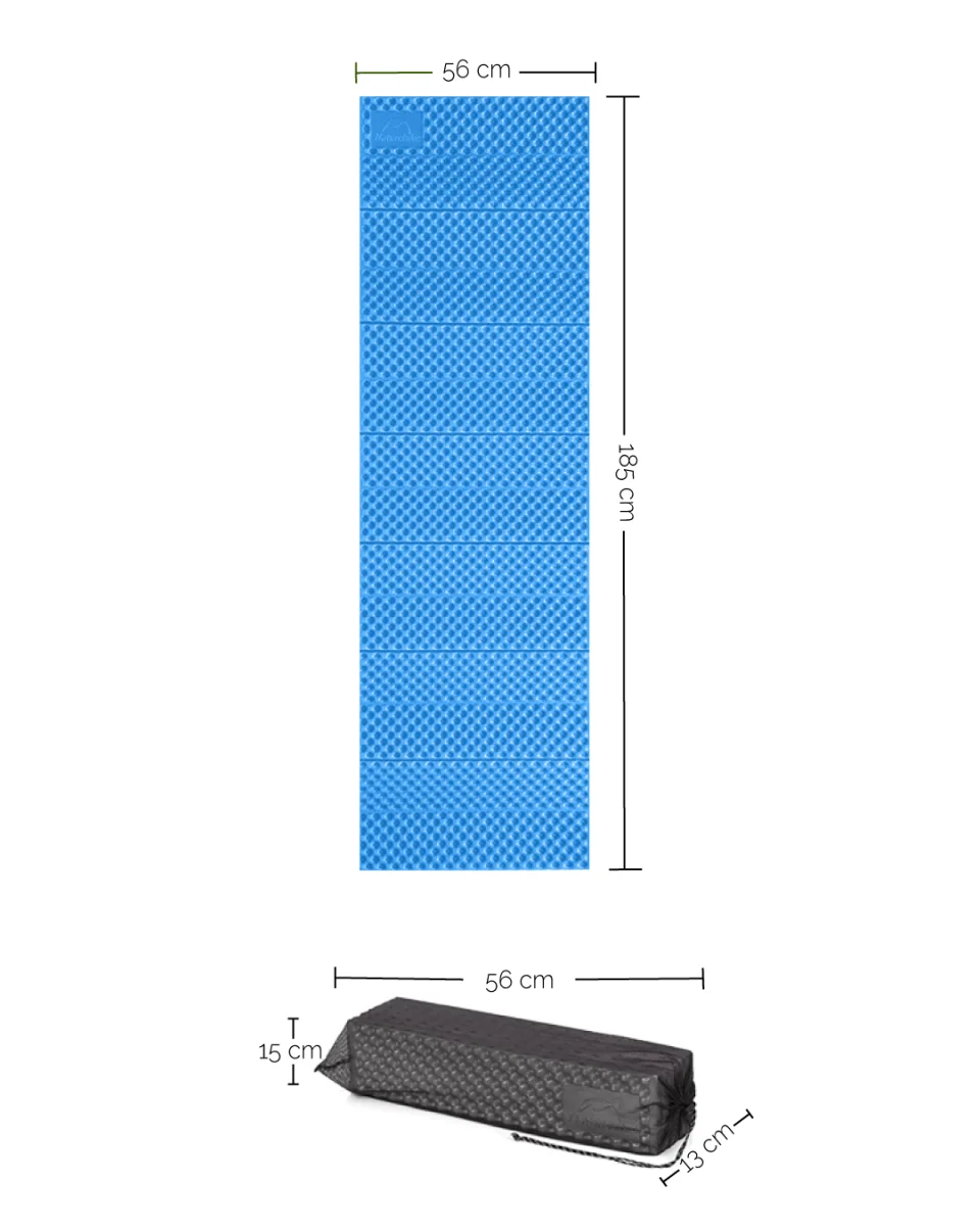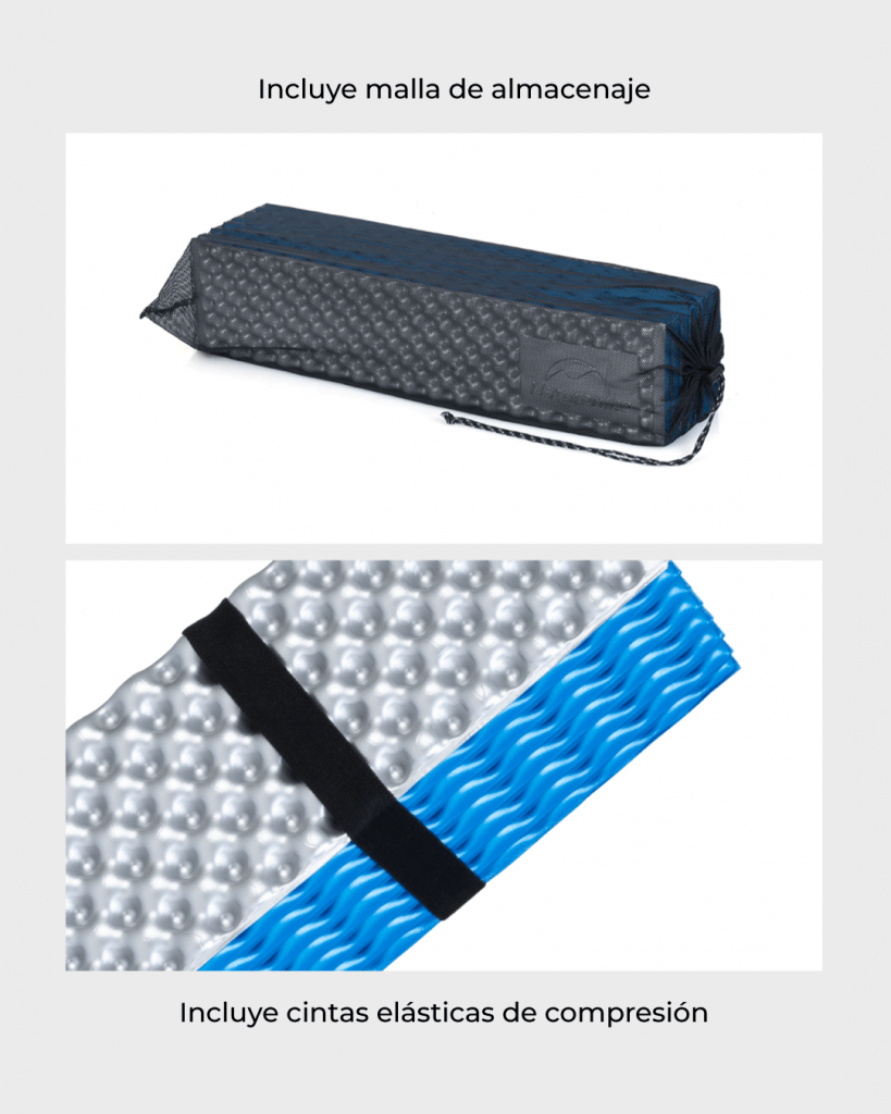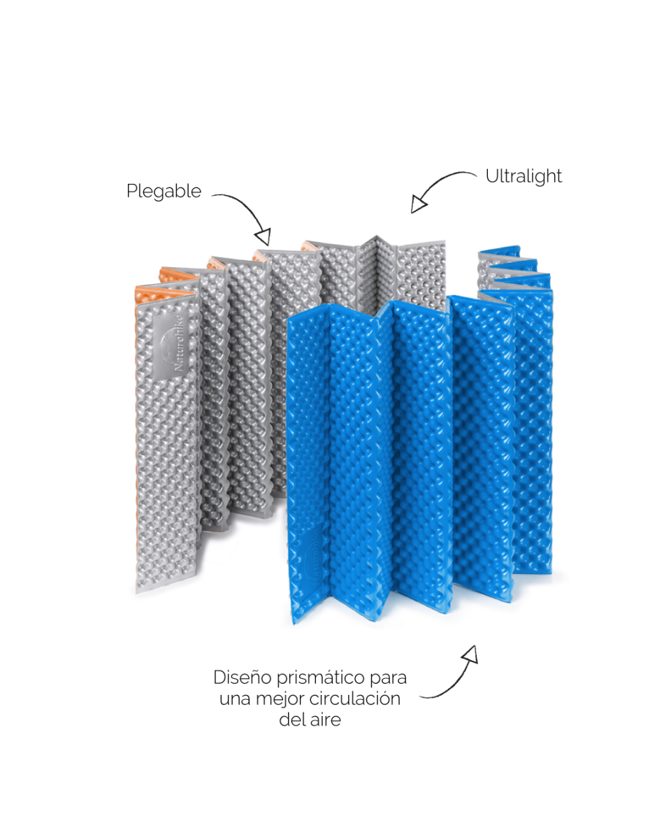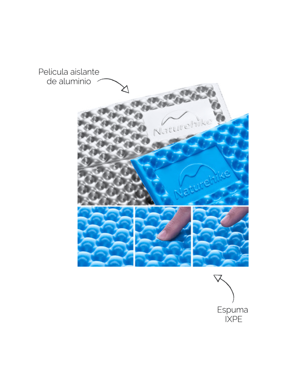 - La colchoneta de espuma plegable aluminizada está elaborada con espuma IXPE y una lámina de aluminio. La espuma IXPE es un material ligero a prueba de agua que permite preservar el calor. Junto con la película de aluminio, generan un aislamiento térmico y una mejor resistencia al desgaste.