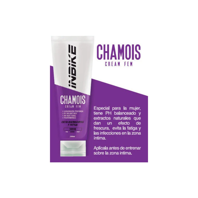 CHAMOIS CREAM Contiene un ph balanceado, componentes naturales y anti bacteriales. Su fórmula libre de parabenos ha sido desarrollada para evitar las quemaduras y llagas ocasionadas por la fricción, el sudor, el calor y las bacterias, protegiendo la piel durante largas distancias y para hidratar profundamente la piel.