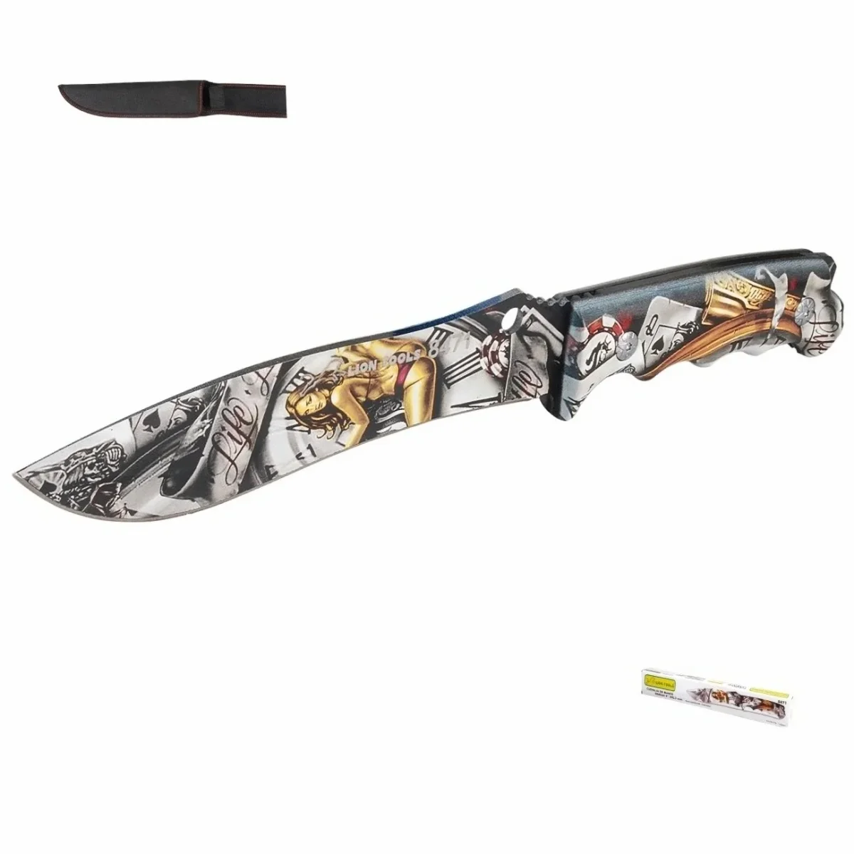 - Cuenta con un acabado decorativo de juegos de azar o barajas, tanto en su cacha como en su hoja, lo que la hace estética y funcional al mismo tiempo