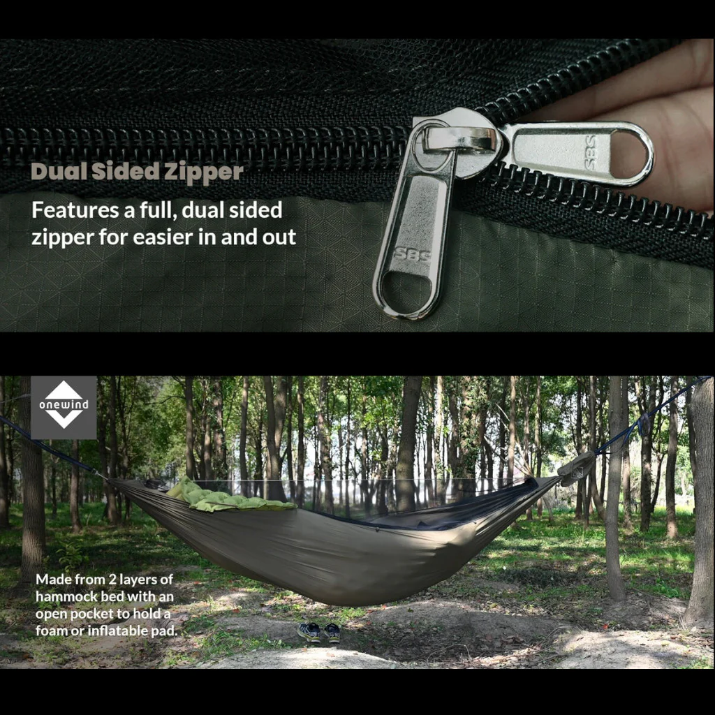 La mejor opción para acampar en hamaca de forma confortable, en un amplio y versátil tamaño, con mosquitero integrado y doble capa para colocar sleeping pads.