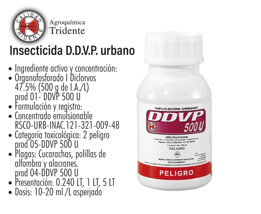 Código: LION-0011 | Ingrediente activo y concentración: Organofosforado 1 Diclorvos 47.5% (500 g de I.A./L) prod 01-DDVP 500 U | Formulación y registro Concentrado emulsionable RSCO-URB-INAC. 121-321-009-48 | Categoría toxicológica: 2 peligro prod 05-DDVP 500 U | Plagas: Cucarachas, polillas de alfombra y alacranes prod 04-DDVP 500 U | Presentación: 0.240 LT, 1 LT, 5 LT | Dosis: 10-20 ml / L asperjado