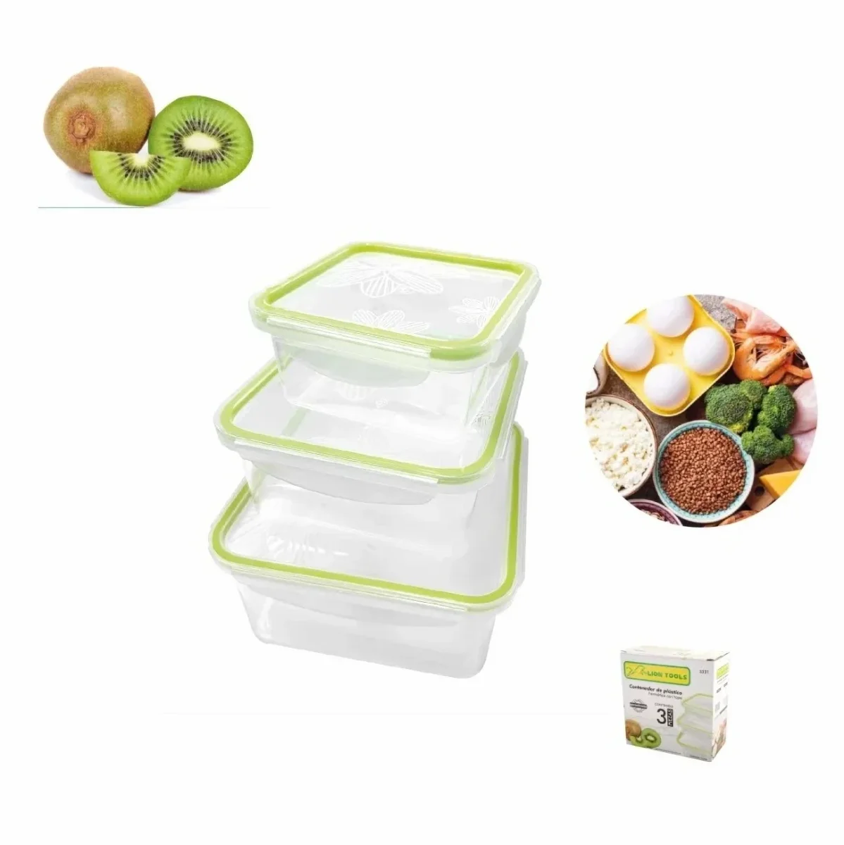 Juego de recipientes herméticos de plástico 3 piezas estos recipientes se utilizan para almacenar alimentos de forma segura y mantenerlos frescos por más tiempo.