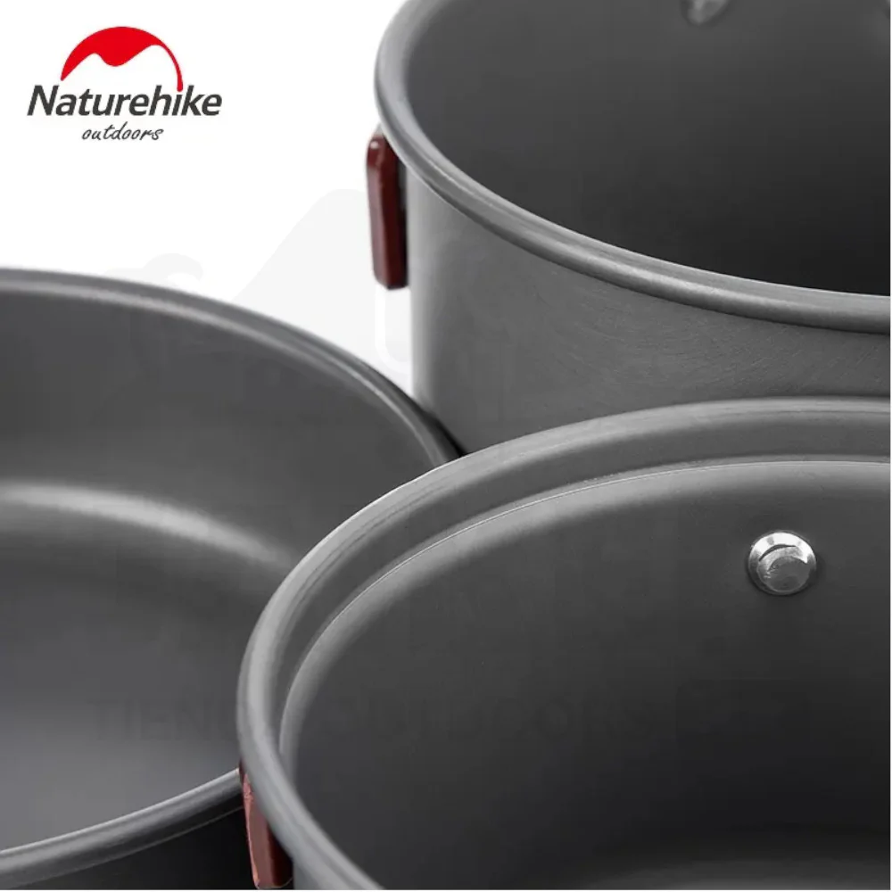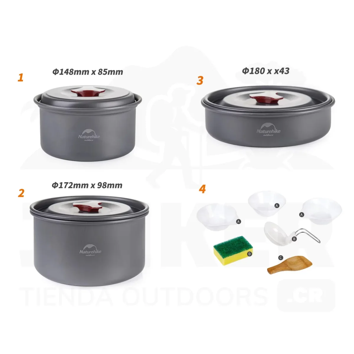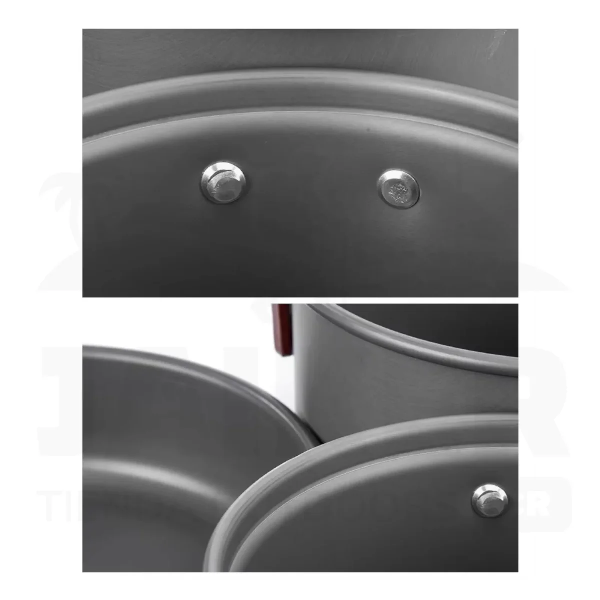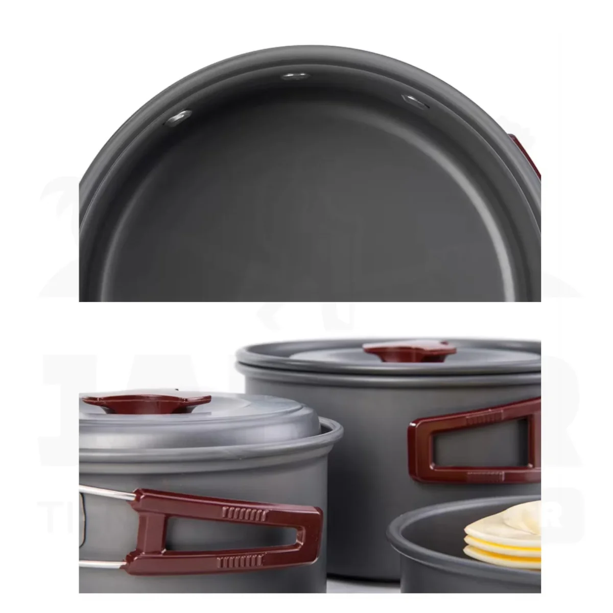 Juego de utensilios de cocina para camping, diseñado para preparar alimentos para dos o tres personas, que se apilan sobre sí mismos para compactar su volumen. Fácil de transportar en mochila o equipaje.