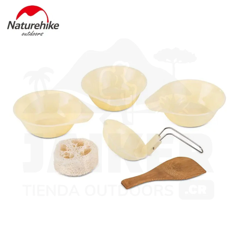 Finalmente, proporciona una cuchara de madera que sirve de espátula para dar vuelta o revolver alimentos, un cucharón sopero y una estopa para lavar los utensilios tras el uso.