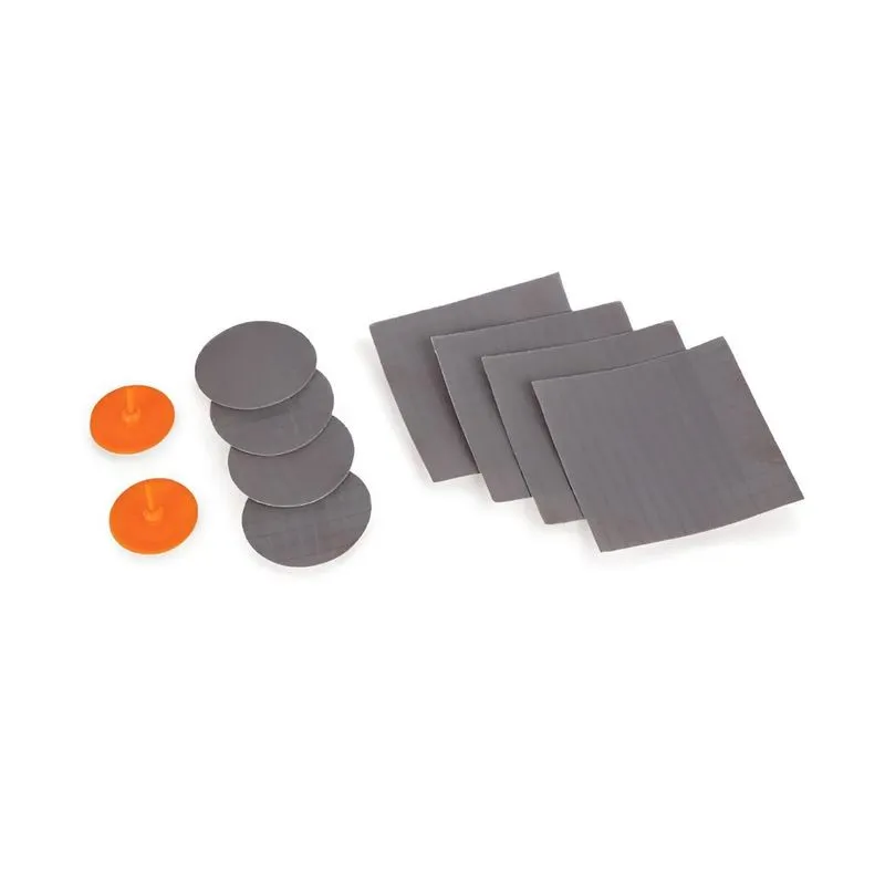• Incluye 4 parches circulares grises de 3 x 3 cm., parches cuadrados grises de 4 x 4 cm., 2 tapas de válvulas de silicona.