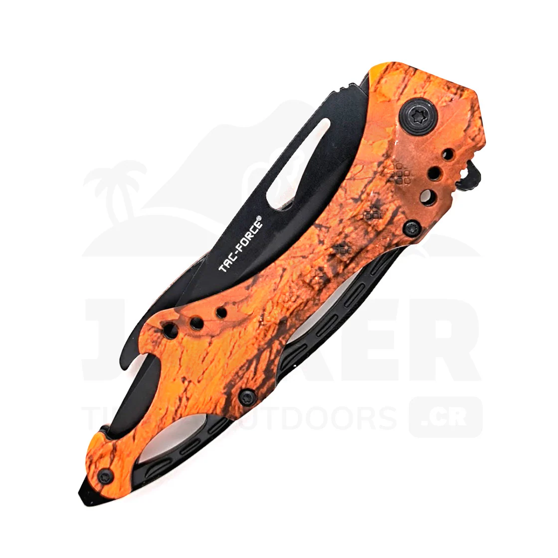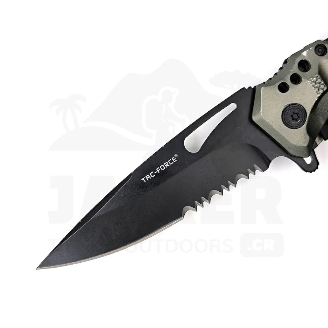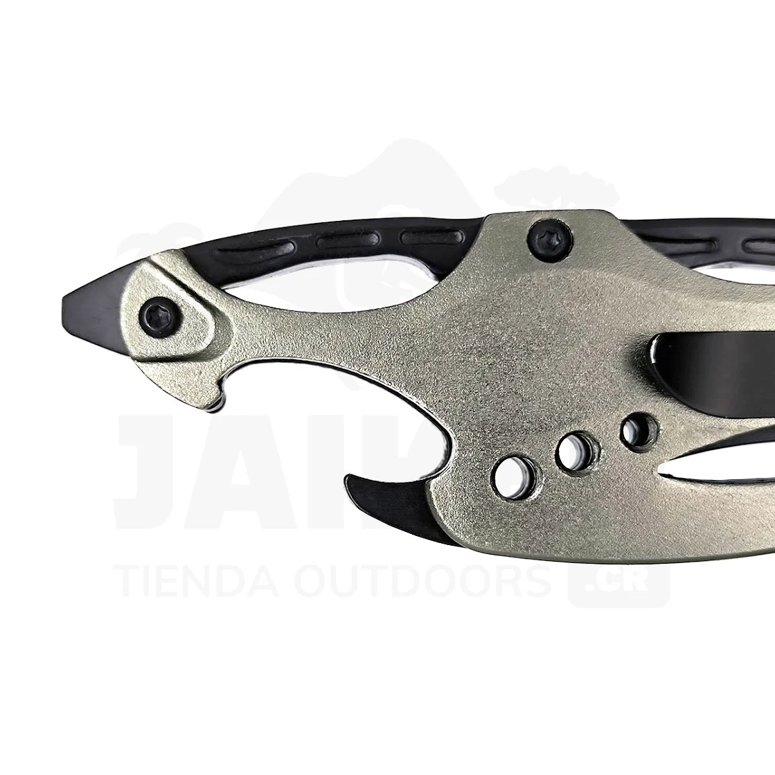 La hoja posee un filo extremo e incluye una sección aserrada para corte de cuerdas o material más sólido, así como un amplio agujero para asistir en nudos y cuerdas.