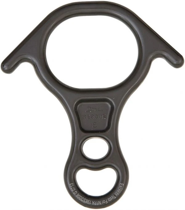 Lo suficientemente grande para manejar las cuerdas más grandes, dos de ellas. Los cuernos extendidos en el anillo superior evitan que la cuerda se deslice hacia arriba y se bloquee al atar. Agujeros dobles en el extremo de amarre los ocho para permanecer unidos al arnés mientras se enhebra la cuerda, evitando la pérdida del dispositivo en condiciones extremas. El estándar de la industria para descensores de grado de rescate