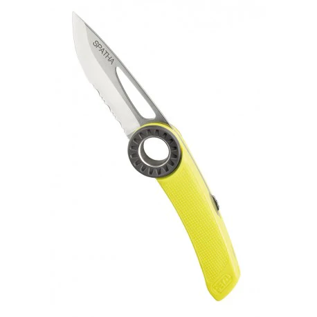La navaja mosquetoneable SPATHA está diseñada para acompañar al escalador en cualquier ascensión. El perfil de la hoja permite cortar fácilmente cuerdas y cordinos. Dispone de un orificio para pasar un mosquetón y colgar la navaja del arnés. Fácil de manipular, incluso con guantes, gracias a la rueda dentada. También dispone de seguro para bloquear la hoja en posición abierta.