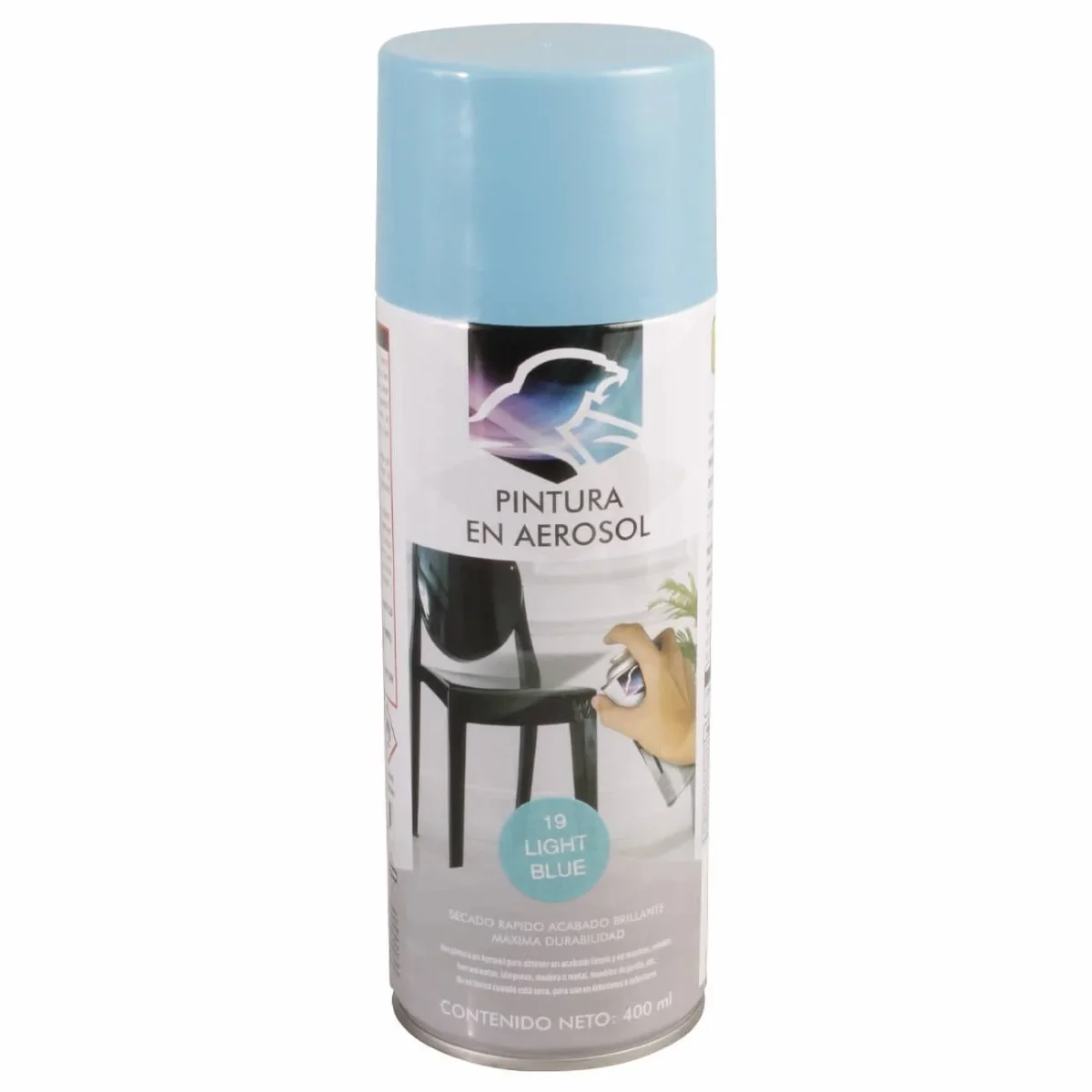 Pintura aerosol azul claro se aplica fácilmente y rápidamente por medio de dosificador y una lata presurizada que ayuda a pulverizar la pintura.