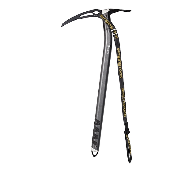 Su diseño permite cortar escalones o plataformas de nieve con facilidad, y la cabeza ergonómica mejora el manejo durante maniobras de autodetención. Además, cuenta con orificios amplios tanto en la cabeza como en la pica, compatibles con mosquetones, lo que aumenta la versatilidad en reuniones o aseguramientos.