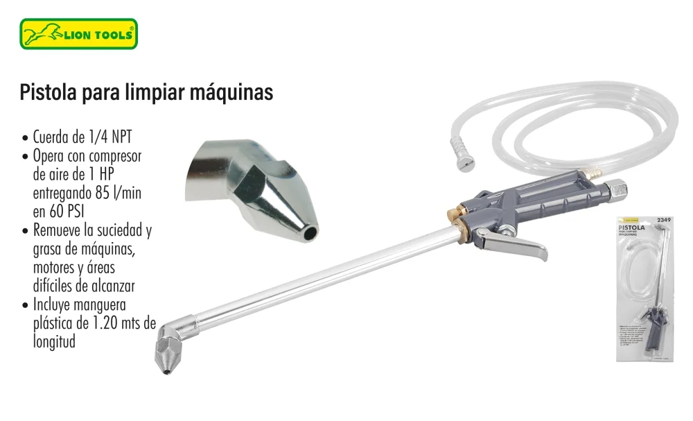 Código: LION-2349 | Cuerda de 1/4 NPT | Opera con compresor de aire de 1 HP entregando 85 l/min en 60 PSI | Remueve la suciedad y grasa de las maquinas, motores y áreas difíciles de alcanzar | Incluye manguera plásticas de 1.20 mts de longitud