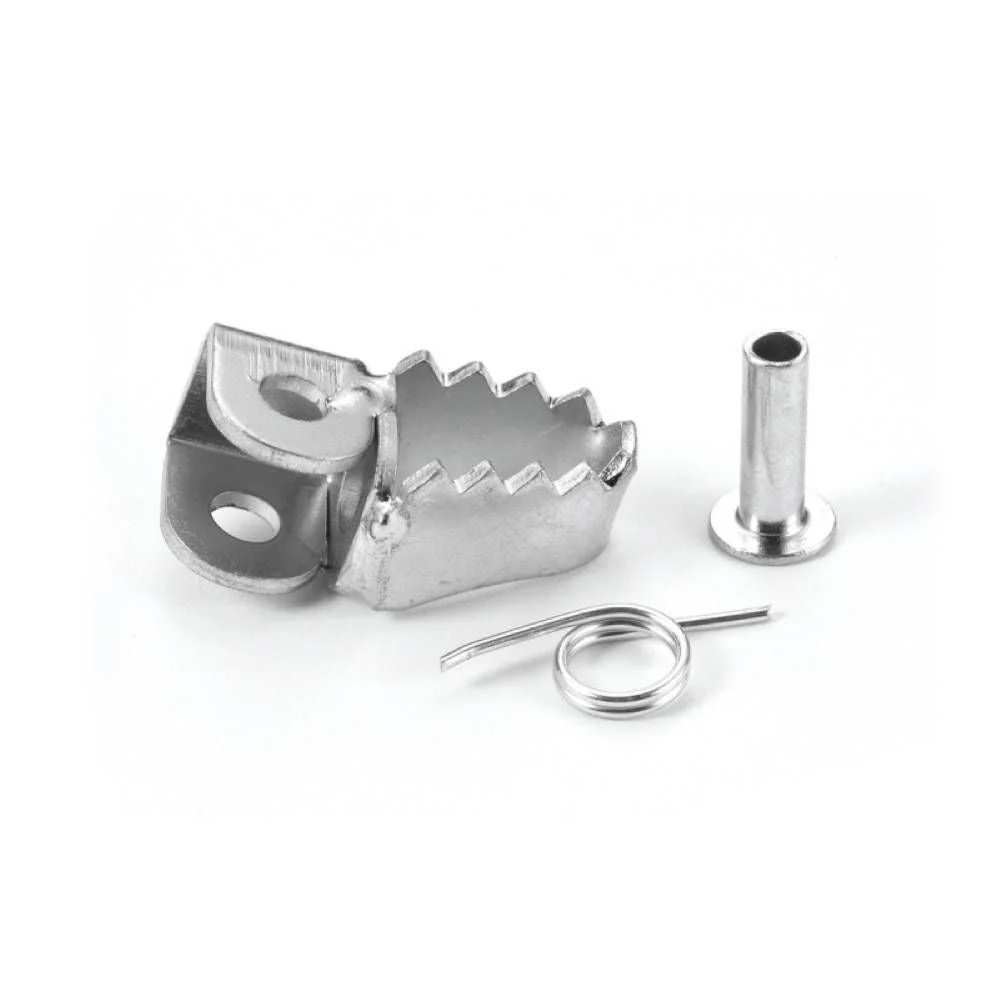 La puntera del freno para motocicleta es un componente del sistema de frenado que se encarga de sujetar las pastillas de freno y aplicar la fuerza de frenado al rotor o tambor. El remache es una pieza metálica que se utiliza para sujetar la puntera del freno al soporte de la horquilla o al soporte de la rueda. El muelle es un componente que ayuda a devolver la puntera del freno a su posición original después de haber sido accionada. Esto ayuda a mantener una tensión adecuada en la puntera del freno, garantizando que el freno se accione de forma suave y precisa.Referencia: HR9030