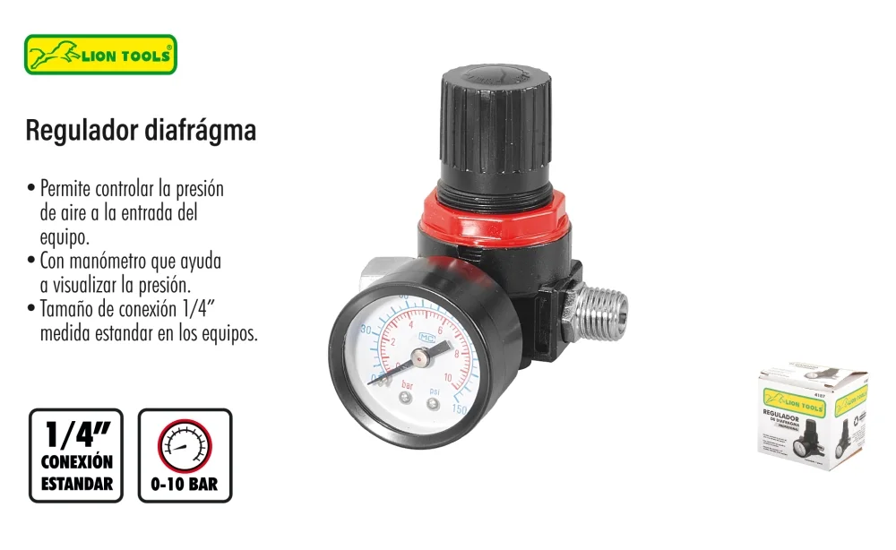 Código: LION-4187 | Permite controlar la presión de aire a la entrada del equipo | Con manómetro que ayuda a visualizar la presión | Tamaño de conexión 1/4″ medida estándar en los equipos