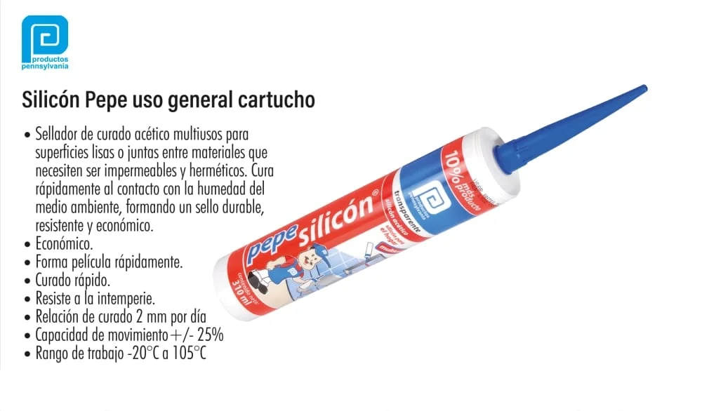 Código: LION-3585 | Marca Productos Pennsylvania | Peso 280ml | transparente Sellador de curado acético multiusos para superficies lisas o juntas entre materiales que necesiten ser impermeables y herméticos. Cura rápidamente al contacto con la humedad del medio ambiente, formando un sello durable, resistente y económico. | Forma película rápidamente. | Curado rápido. | Resiste a la intemperie. | Relación de curado 2 mm por día | Capacidad de movimiento+/- 25% | Rango de trabajo -20°C a 105°C
